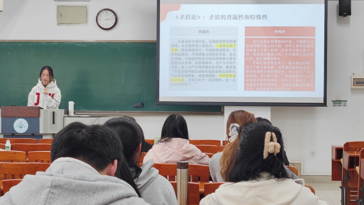 在阐释形而上学宇宙观时,张懿同志以海州盐业发展的历史教训为例,说明忽视事物内部矛盾运动、固守传统生产模式的思维模式终将导致发展停滞;结合中国古代朝代更迭规律指出,静止、孤立的形而上学观点无法正确认识社会发展的根本动力。而在讲解唯物辩证法时,她以国产盾构机的发展历程为鲜活案例,从初期的技术封锁,到直面“直径升级与技术难度增长”的核心矛盾,最终通过持续创新实现从“跟跑”到“领跑”的跨越,生动诠释了“事物发展的根本原因在于内部矛盾”的深刻内涵。