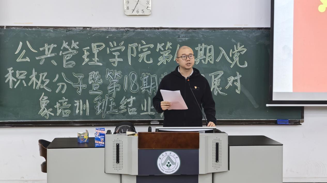 为总结与表彰培训成果,巩固与深化党课学习实效,我院于2025年12月4日12:30在第三教学楼212教室举行第100期入党积极分子暨第18期党员发展对象培训班结业典礼。本节党课由公共管理学院党委组织员周毅老师主讲,163名入党积极分子和72名发展对象参加。