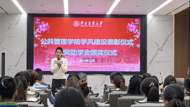 12月18日下午,公共管理学院2025年学风建设表彰仪式暨奖助学金颁奖仪式在学院中会议室隆重举行。学院党委副书记王希、广东东图规划科技有限公司副总经理郭敏、广州市睿宝机械有限公司总经理助理邱雪琼、行政管理系主任武玉坤、公共事业管理系主任朱汉平、社会保障与风险管理系主任徐强、土地资源管理系副主任李玮、社会工作系副主任曾永辉、公共管理学院辅导员朱浩权以及获奖师生出席本次颁授仪式。