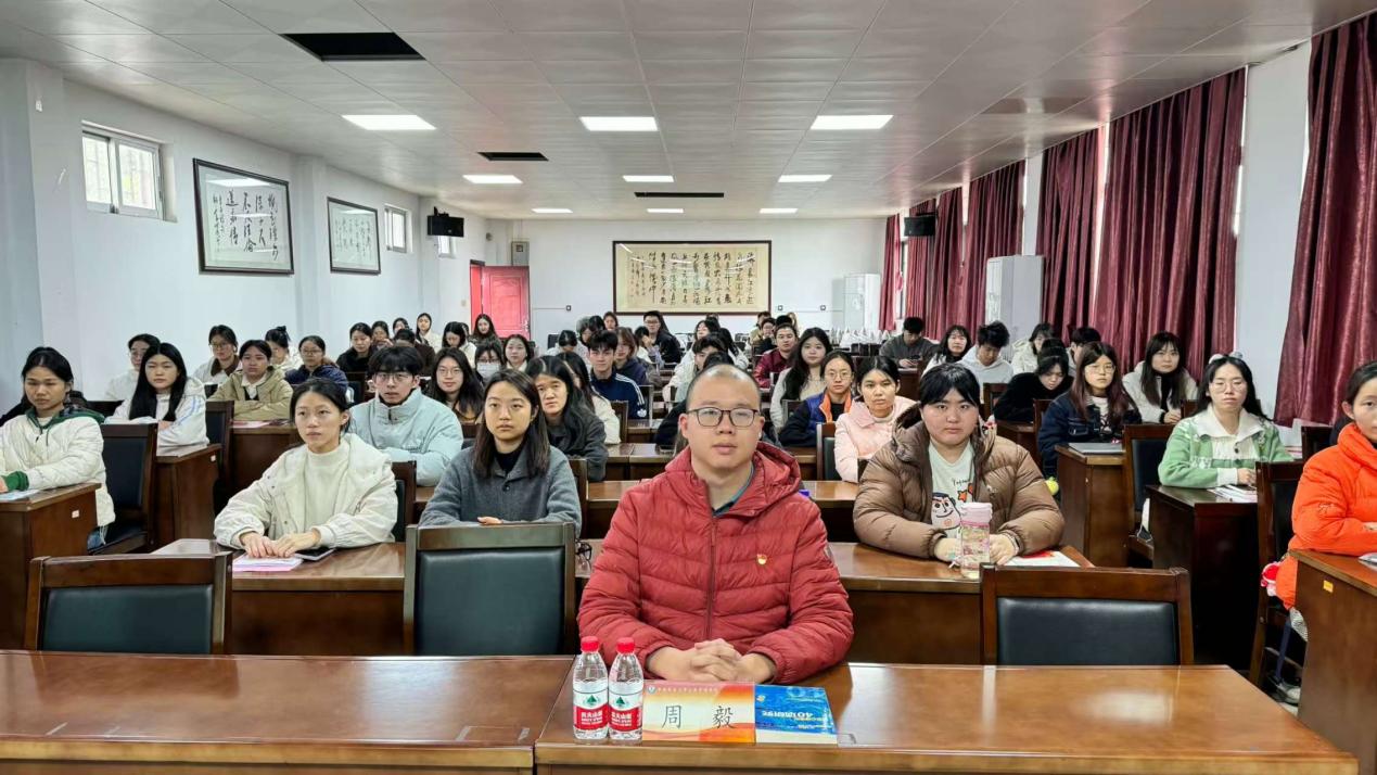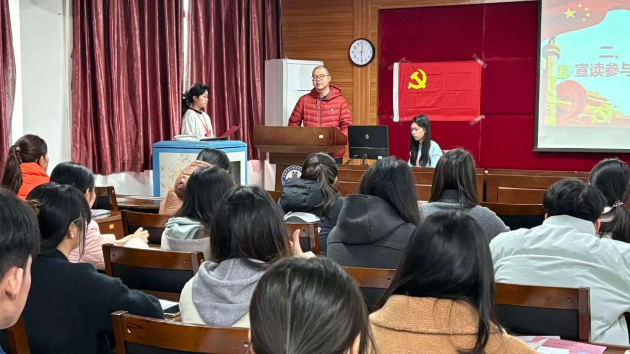 大会第二项,周毅老师致辞。周老师首先向各位新发展的预备党员同志表示祝贺,并围绕“加强党性修养和思想政治建设”这一主题,对预备党员提出要求和期望。他强调,要端正入党动机,坚定理想信念,始终坚守正确的政治立场和信仰。