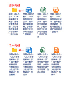 请注意:所有附件放置到以【“学院+个人/团队名称+2026年华南农业大学“青年数字素养调研、乡村非物质文化遗产专项调研”报名材料”】命名的文件夹中,所有文件需以【“学院+个人/团队名称+2026年华南农业大学“青年数字素养调研、乡村非物质文化遗产专项调研”报名表/汇总表/责任书】的形式命名,团队内成员的责任书需要合并在同一份pdf文件中提交。