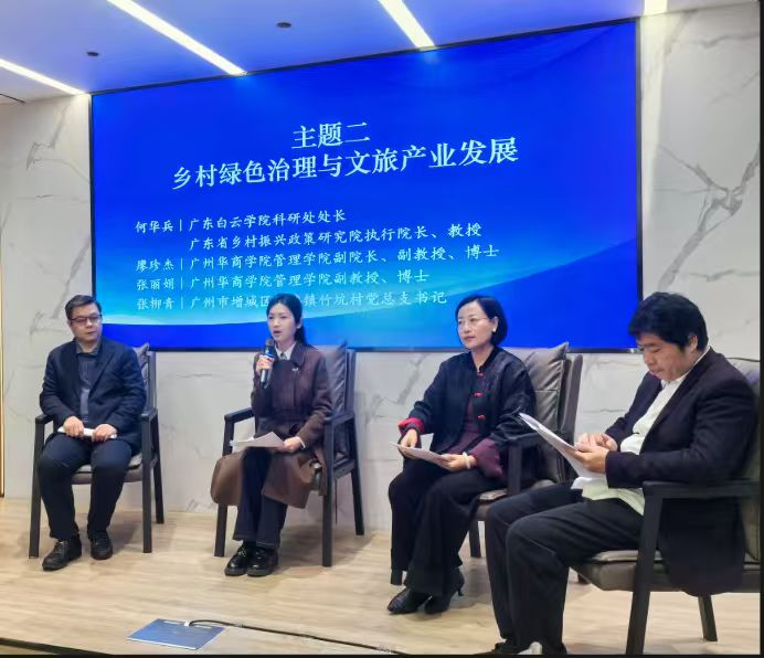圆桌论坛第二个主题为“乡村绿色治理与文旅产业发展”。广东白云学院科研处处长何华兵教授、广州华商学院管理学院副院长廖珍杰副教授、张丽娟副教授、广州市增城区小楼镇竹坑村原党总支书记张柳青分别围绕乡村如何实现低碳转型、文化记忆如何赋能乡村文旅产业发展、乡村文化建设与乡村旅游高品质发展、积分制何以成为乡村人居环境治理的可持续发展机制等主题进行了讨论。