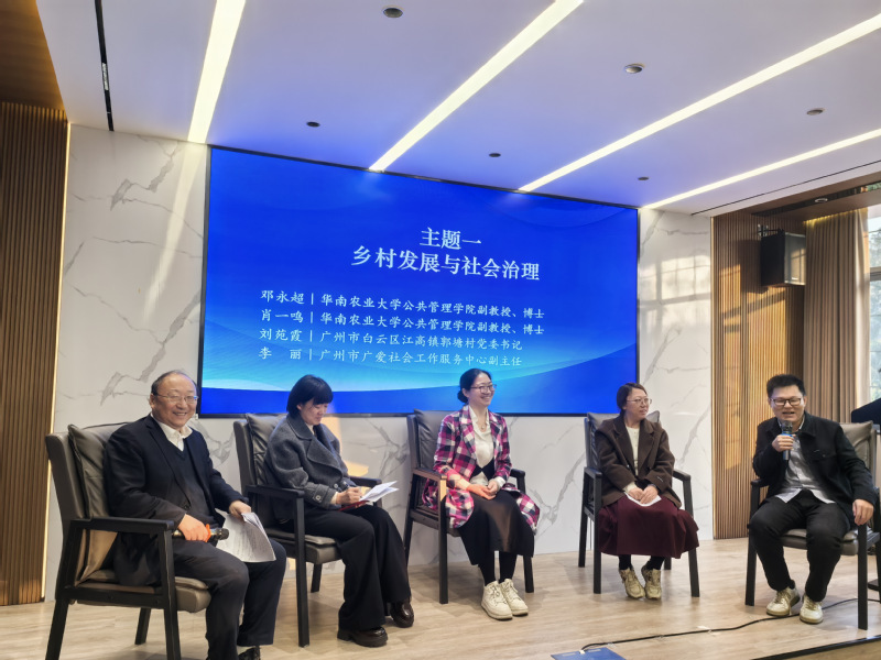 圆桌论坛环节由史传林教授主持。论坛分为两个主题,第一个主题为“乡村发展与社会治理”。华南农业大学公共管理学院邓永超副教授、肖一鸣副教授,广州市白云区江高镇郭塘村党委书记刘苑霞、广州市广爱社会工作服务中心副主任李丽分别围绕经理人制度如何赋能新型农村集体经济发展、村民在乡村绿色化和数字化双重转型中是否收益、乡村发展如何“留人留心”以及乡村社会服务等内容分享了自己观点。