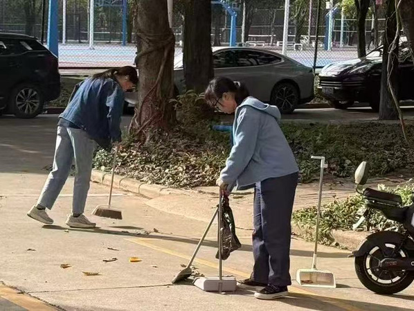 活动开始前,工作人员对宿舍楼周边及训练馆等区域进行了合理规划,明确了各小组的具体分工与职责。随后,在工作人员的引导下,志愿者们手持扫帚、垃圾袋等清洁工具,迅速投身于清扫工作。大家分工明确、配合默契,认真细致地清扫每一个角落,不放过任何一处卫生死角。经过一番辛勤劳作,宿舍楼周边和训练馆区域面貌焕然一新,校园清扫志愿活动顺利结束。